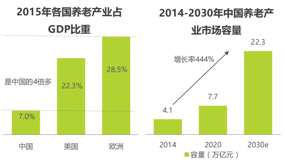 在此背景下,养老服务业或将成为最具潜力的“朝阳产业”。艾瑞咨询预计在2020年我国养老产业的市场规模将达到7.7万亿元,2030年达到22.3万亿元。