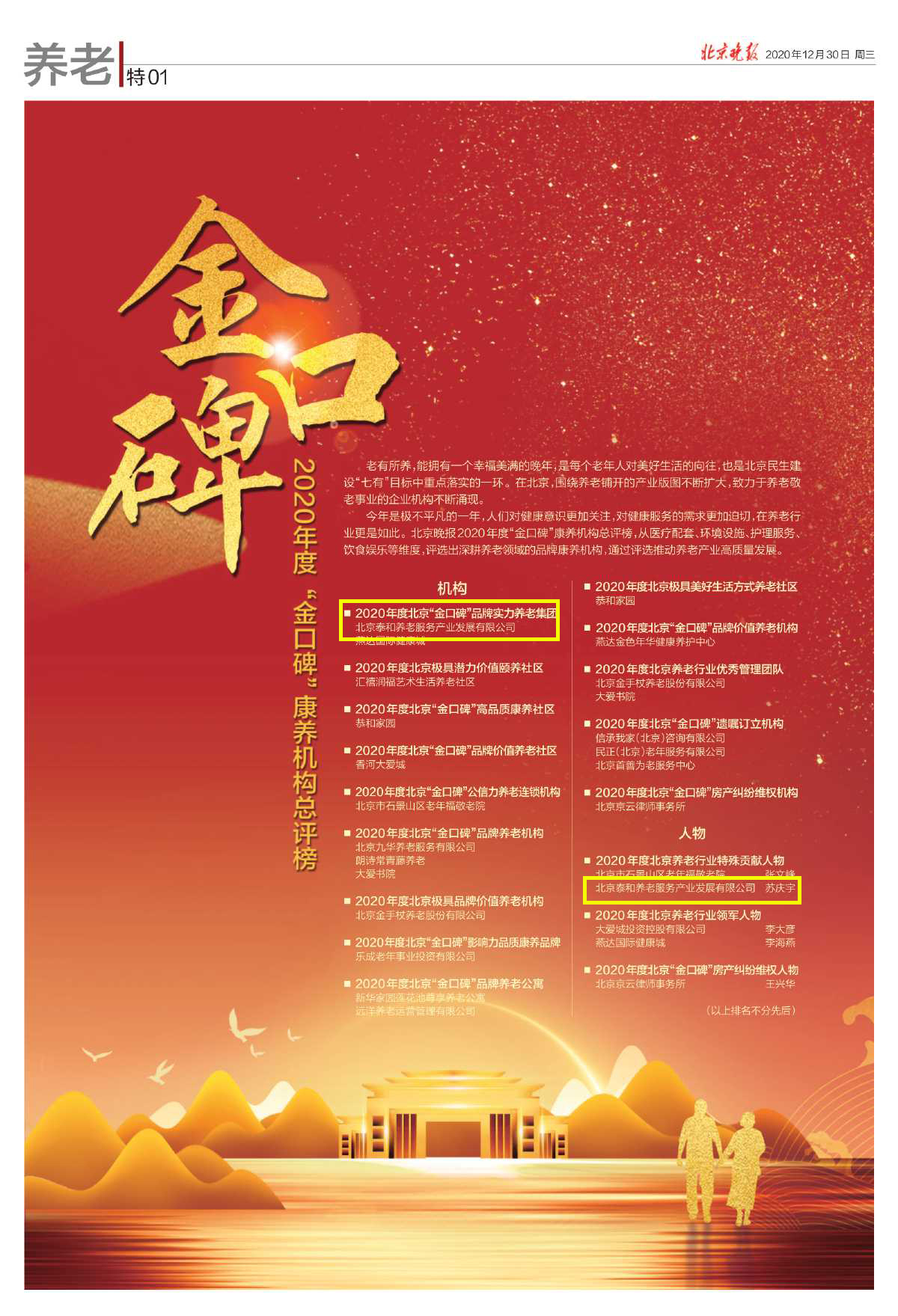 2020年12月30日,北京晚报公布2020年度“金口碑”康养机构总评榜榜单,ok138cn太阳集团(以下简称“ok138cn太阳集团”)旗下北京泰和养老服务产业发展有限公司以下简称“泰和养老院”)荣获“2020 年度北京'金口碑'品牌实力养老集团"称号,同时,泰和养老院总经理苏庆宇获评”2020年度北京养老行业特殊贡献人物“奖。