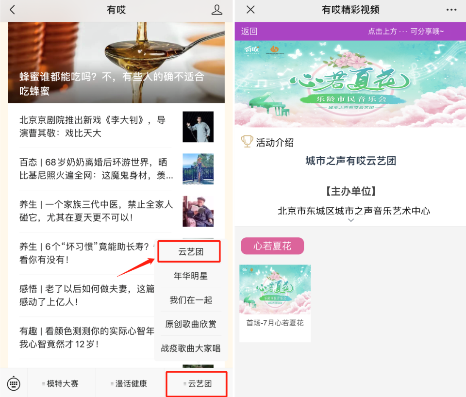 有哎云艺团旨在帮助中老年人在线上实现艺术心灵的碰撞和交流,让普通市民也能成为线上艺坛的主角。展示的内容将在有哎—乐龄文化交流社区、歌华有线——“年华”频道等线上平台播出。每月一期。首期《“心若夏花”•乐龄市民音乐会》已于8月7日推出。