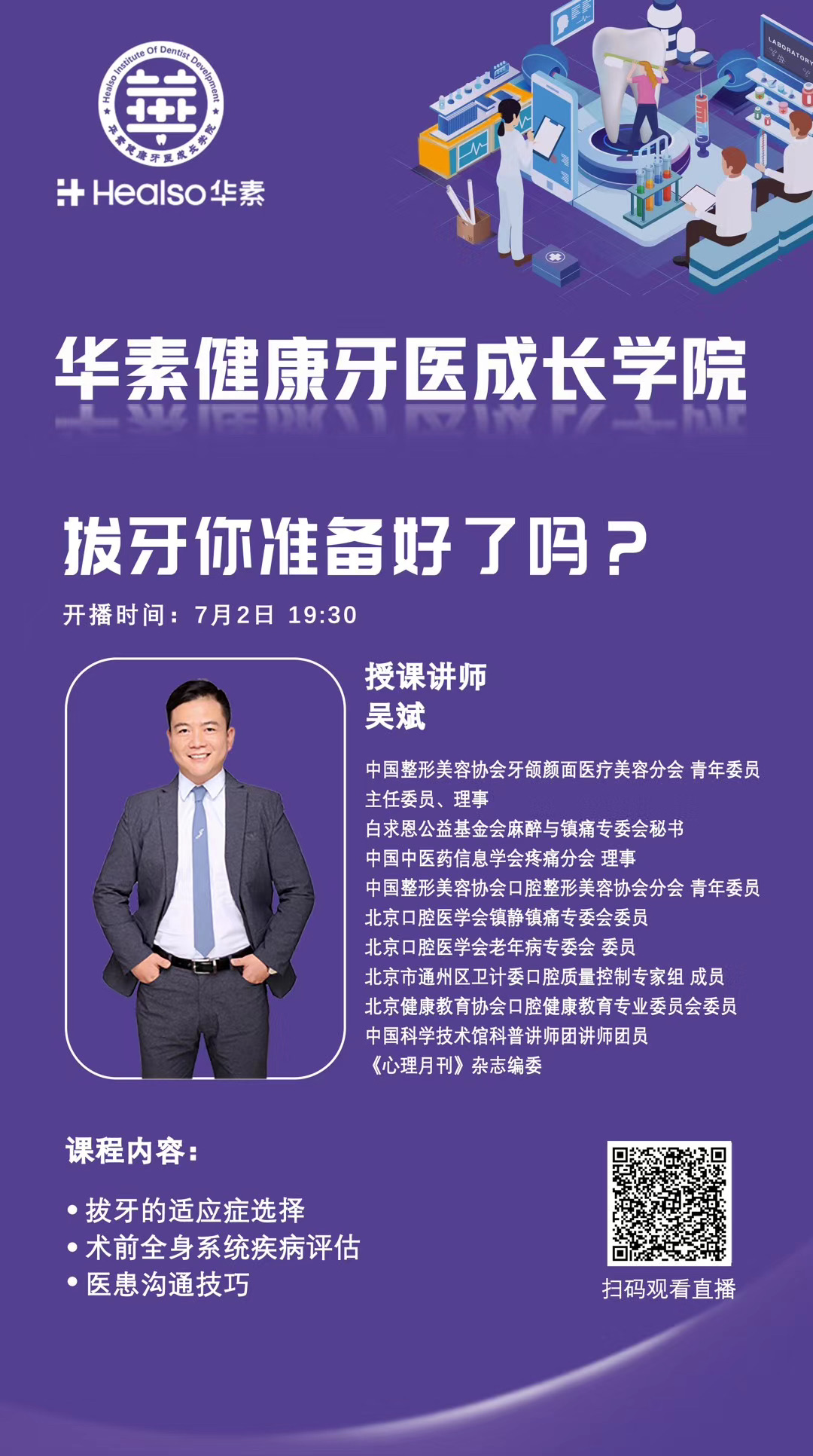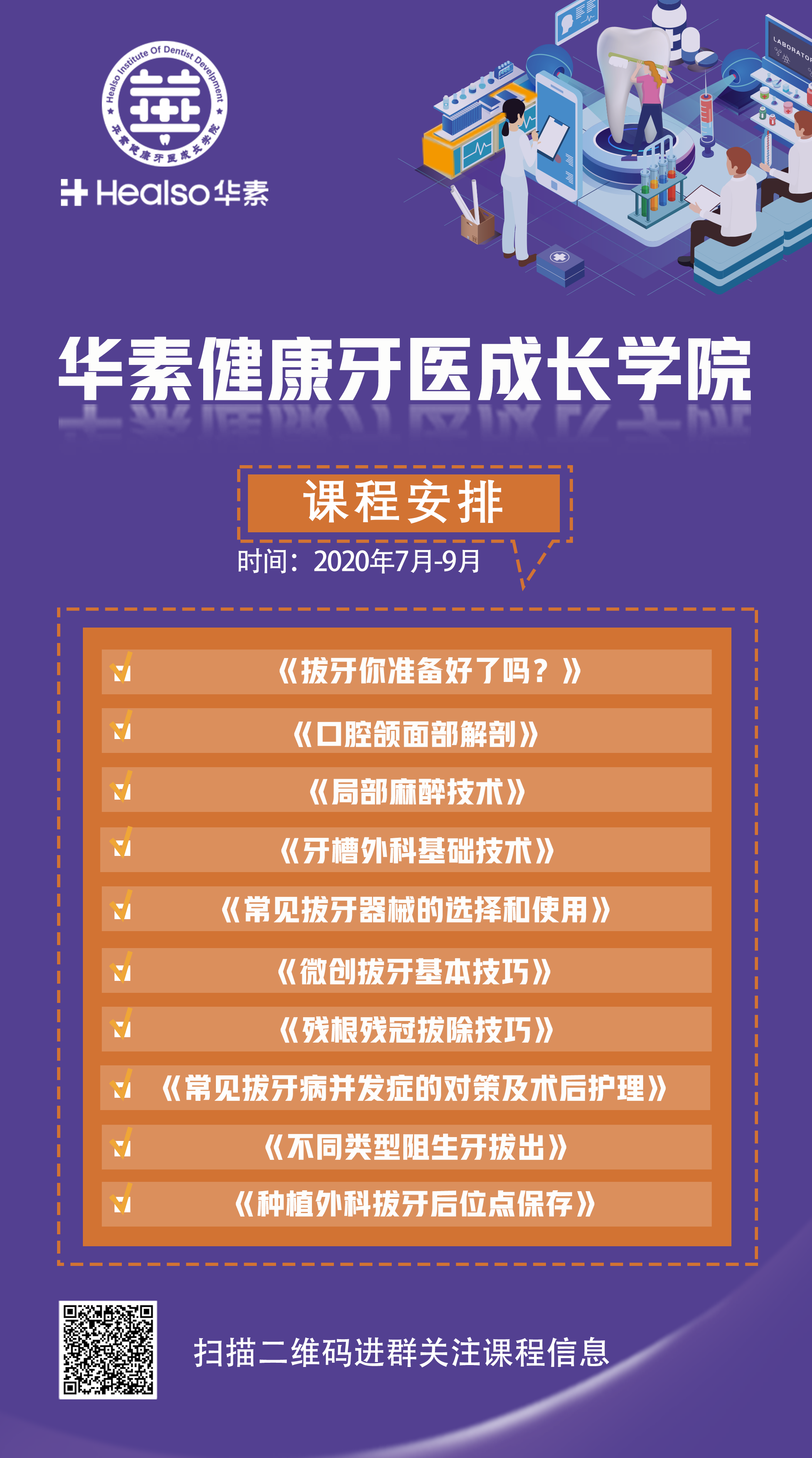 2020年7月2月19:30,由ok138cn太阳集团旗下华素愈创-华素健康牙医成长学院开设的首期线上直播课程即将开课,此次授课内容以基础“拔牙”治疗技术为主,延请名师,为听众进行系统教学。