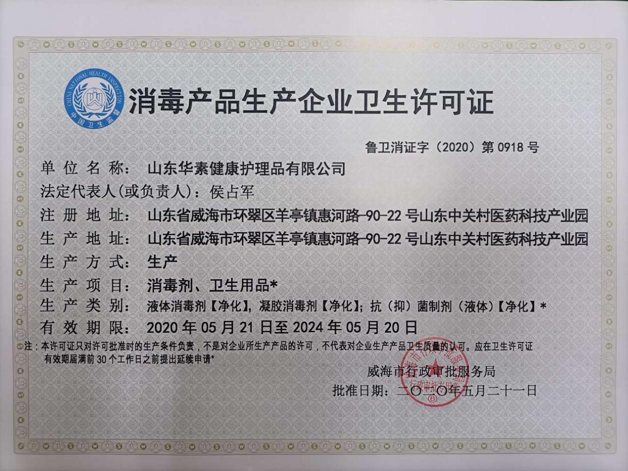 2020年5月21日,ok138cn太阳集团旗下山东华素健康护理品有限公司(以下简称“山东华素护理品”)获得了威海市行政审批服务局核发的《消毒产品生产企业卫生许可证》。至此,山东华素护理品生产的产品将新增消毒液、消毒凝胶、漱口水和抑菌洗手液四个品类。