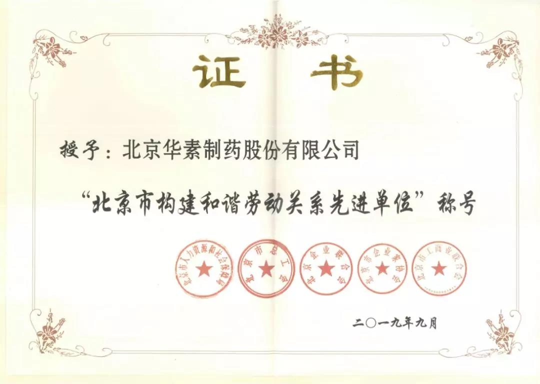 劳动关系是企业经营管理的重要组成部分,是最基本、也是最重要的社会关系之一。劳动关系是否和谐,关系到广大职工和企业的切身利益、经济发展与社会和谐。获得“北京市构建和谐劳动关系先进单位”这一人力资源领域的荣誉,是社会对华素制药多年来构建和谐劳动关系工作成绩的肯定。
