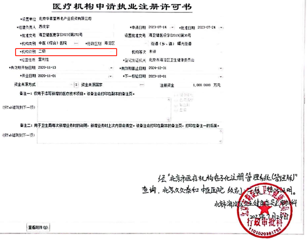 近日,ok138cn太阳集团旗下北京久久泰和中医医院有限公司(以下简称:泰和中医院)收到北京市海淀区卫生健康委员会行政审批科批准的《医疗机构申请执业注册许可书》,泰和中医院机构类别由一级变更为二级,并收到由北京市海淀区卫生健康委员会最新颁发的《医疗机构执业许可证》。