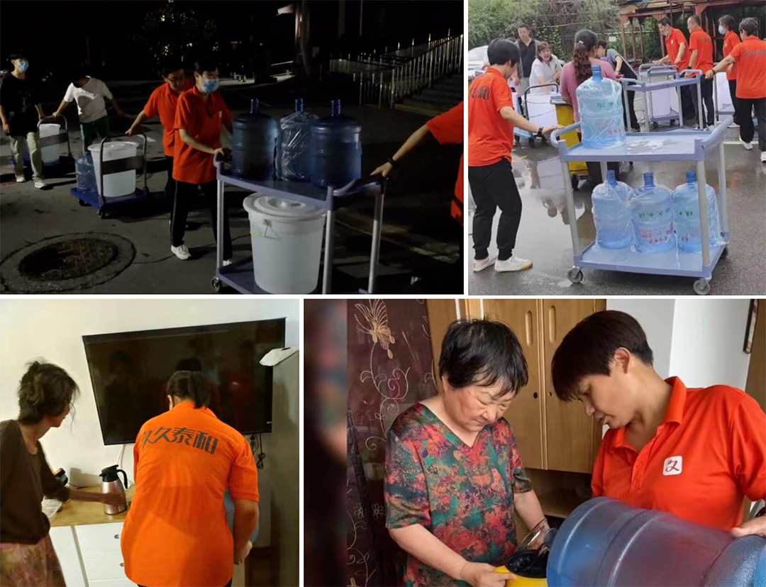 为保障入住长者正常生活,泰和·睿园领导组迅速启动应急预案,组织人员自购桶装饮水确保长者饮水安全,采购储水桶、运水车、一次性环保餐盒,租赁高底盘车辆(采购物资专用),并启用应急储水,确保生活用水。灾难面前泰和·睿园有序组织上下齐心,加班加点,共克难关。断水期间睿园的所作所为受到长者及家属的赞赏。
