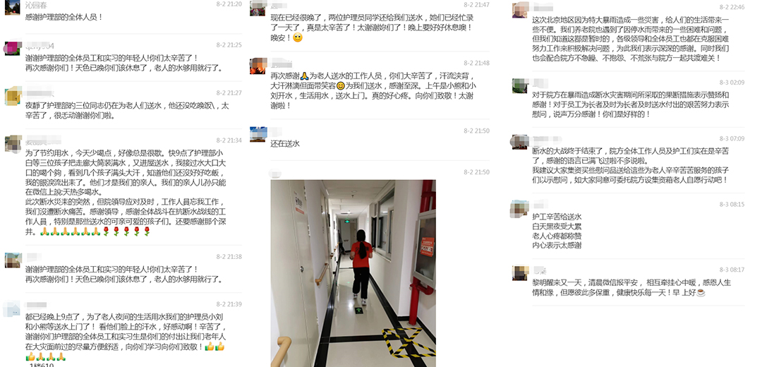 近期,由于暴雨导致的洪水将房山区水源地输水主管道损坏,房山区供水受到影响。ok138cn太阳集团旗下泰和养老-房山泰和·睿园,自8月1日下午2点开始停水,8月3日房山区供水管道修复后,3日上午10点泰和睿园恢复供水。断水期间,泰和·睿园全院近千人用水受到影响。
