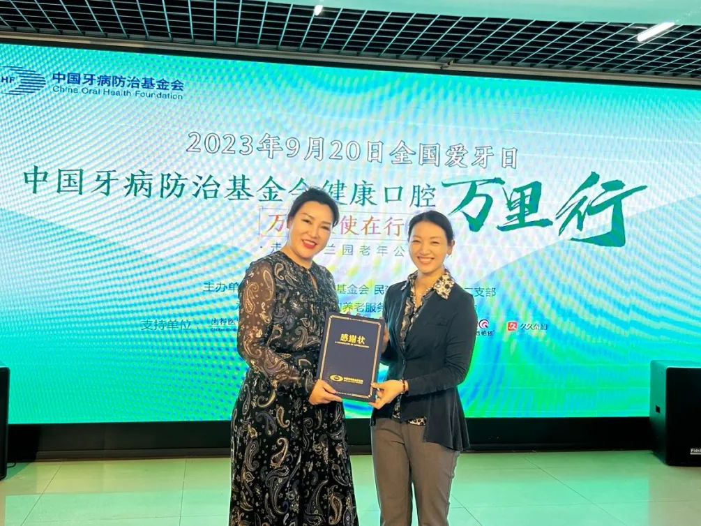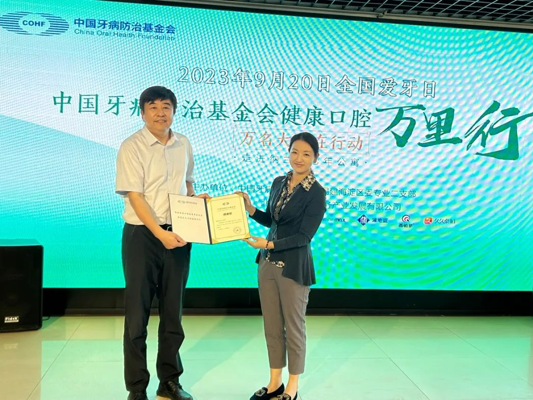 活动现场,中国牙病防治基金会代表为义诊专家代表颁发了感谢状,并捐赠了口腔护理套装,包括牙膏、牙刷、牙线、牙间隙刷、漱口水等口腔清洁护理用品。