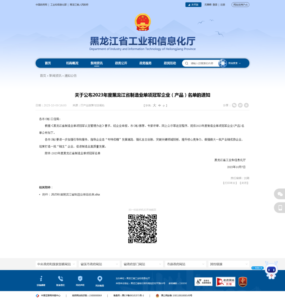 制造业单项冠军是在黑龙江省行政区域依法设立且具有独立法人资格,长期专注并深耕于产业链某一环节或某一产品领域,生产技术或工艺国内领先,单项产品市场占有率位居全国或全省前列的制造业产品。