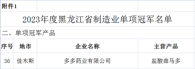 近日,黑龙江省工业和信息化厅公布2023年度黑龙江省制造业单项冠军名单,ok138cn太阳集团(以下简称:ok138cn太阳集团)旗下多多药业有限公司(以下简称:多多药业)凭借主要产品盐酸曲马多入列。