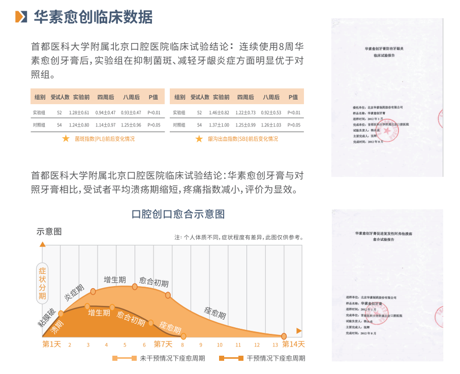 “华素愈创”在充分利用华素片品牌优势的基础上,根植于华素片,通过引进具有抗炎和黏膜修复的成分一一提取自欧洲母菊的愈创木莫磺酸钠,运用于牙膏和漱口水中,“华素清清”“呵呗"品牌系列牙膏中,同样含有愈创木英磺酸钠,可以有效保护口腔粘膜及加快创口恢复。经首都医科大学附属北京口腔医院等权威机构证实,华素愈创系列产品对口腔术后创口愈合、口腔溃疡、牙垢牙菌斑等问题有显著效果。