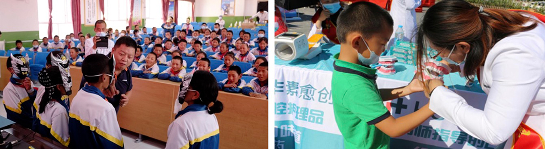 在“小小牙医”科普活动中,“华素愈创”教现场的小嘉宾们为自己的爷爷、奶奶、爸爸、妈妈们检查牙齿,学习如何正确刷牙、如何保护牙齿;在“山中雏菊 筑梦同行”公益活动中,“华素愈创”为孩子们捐赠儿童口腔护理产品,并为他们对口腔护理知识进行了科普;2022年,还联合社区药房开展了口腔科普和募捐活动,为新疆喀什地区捐助了10万余元华素愈创儿童口腔护理产品。华素健康始终坚守公益初心,积极践行企业社会责任,希望通过提升儿童的口腔健康,进而提升全民身体健康。