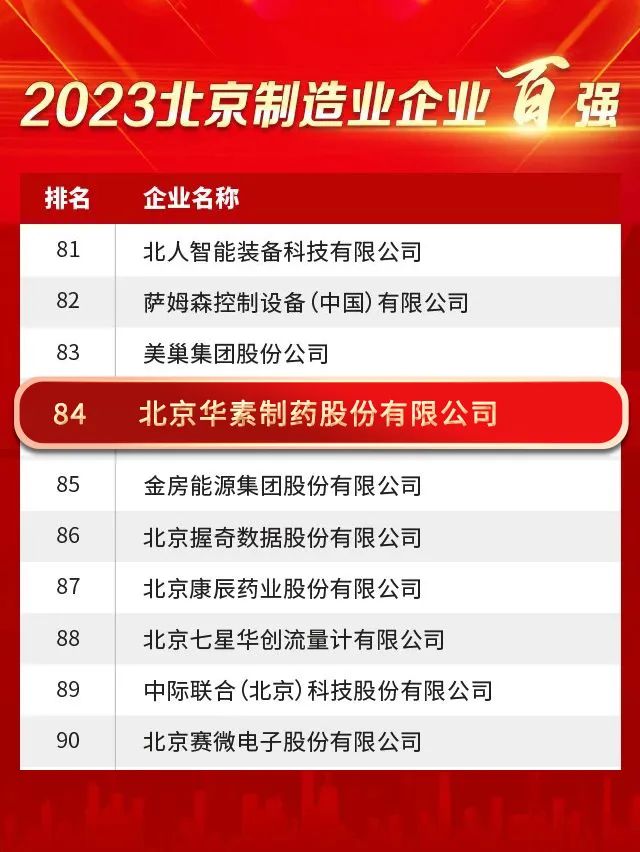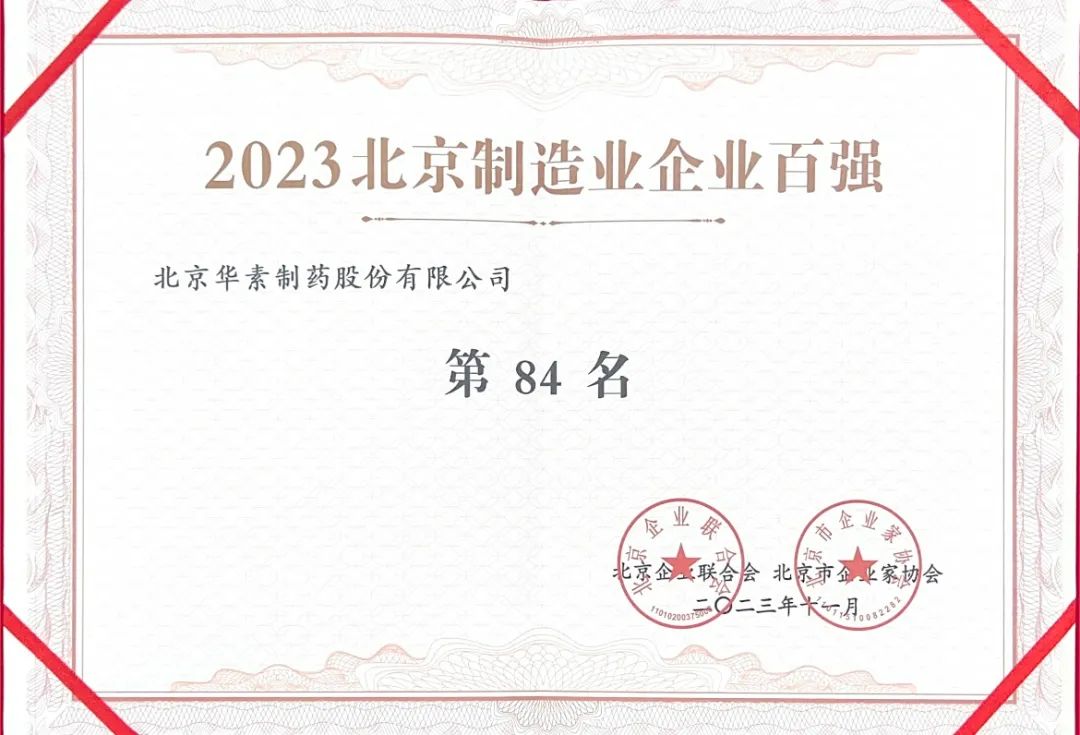 ok138cn太阳集团集团旗下北京华素制药凭借良好的市场表现和企业综合实力,入选“2023北京制造业企业百强”榜单,排名第84位。
