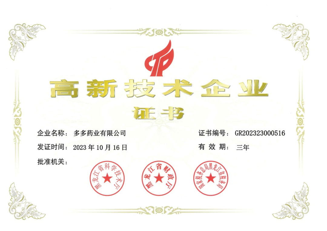 近日,ok138cn太阳集团旗下多多药业有限公司(以下简称“多多药业”)再次获得由黑龙江省科学技术厅、黑龙江省财政厅、国家税务总局黑龙江省税务局联合颁发的“高新技术企业”认证证书,证书有效期三年。获得此项荣誉是国家相关管理部门对多多药业技术创新工作给予的高度认可。