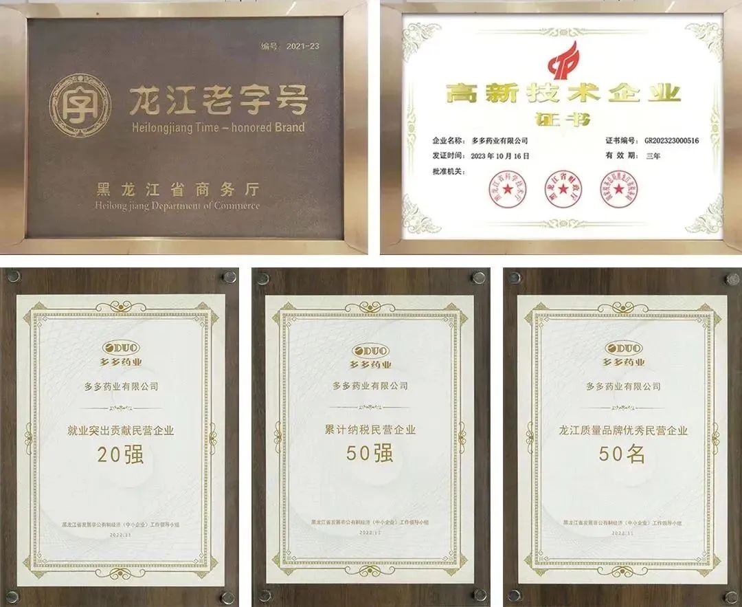 多多药业不仅在佳木斯市享有盛誉,更获得了多项国家级、省级荣誉,“多多”牌商标也被评为黑龙江省著名商标。2023年,多多药业凭借其优秀的技术实力和创新能力,再次获得由黑龙江省科学技术厅、黑龙江省财政厅、国家税务总局黑龙江省税务局联合颁发的“高新技术企业”认证证书;此外,它还被授予诚信企业及A级纳税人的称号,成功通过了新一轮《知识产权管理体系》认证评审,并荣获“国家知识产权优势企业”的称号。2022年-2023年,多多药业更上一层楼,获得“龙江老字号”企业称号;黑龙江省“龙江质量品牌优秀民营企业50强”“就业突出贡献民营企业20强”“累计纳税民营企业50强”“黑龙江制造业民营企业100强”,这些荣誉不仅是政府相关单位及市场对多多药业多年来的努力和成就的肯定,也让公司未来的发展充满鼓舞和激励。
