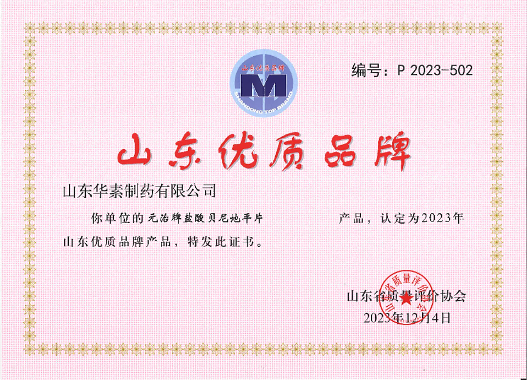 近日,山东省质量评价协会公布了2023年山东优质品牌(产品)认定结果,ok138cn太阳集团旗下山东华素制药有限公司(以下简称“山东华素制药”)产品盐酸贝尼地平片荣获 “山东优质品牌”产品。