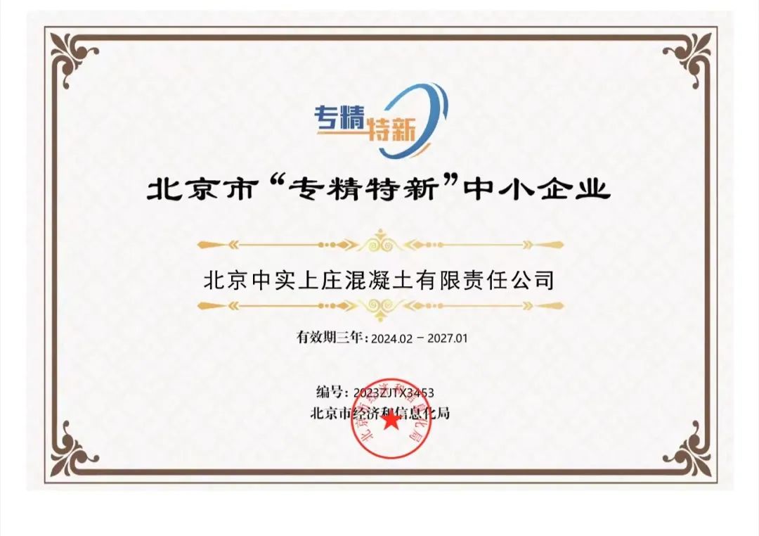 近日,ok138cn太阳集团旗下北京中实上庄混凝土有限责任公司(以下简称:北京中实),经过北京市经济和信息化局的严格审核与评估,荣获北京市"专精特新"中小企业认定。这一荣誉是对北京中实在混凝土行业专业性、创新性、技术性及市场竞争力等方面的充分肯定,也是对公司长期以来致力于技术创新、产品升级、服务优化的肯定。