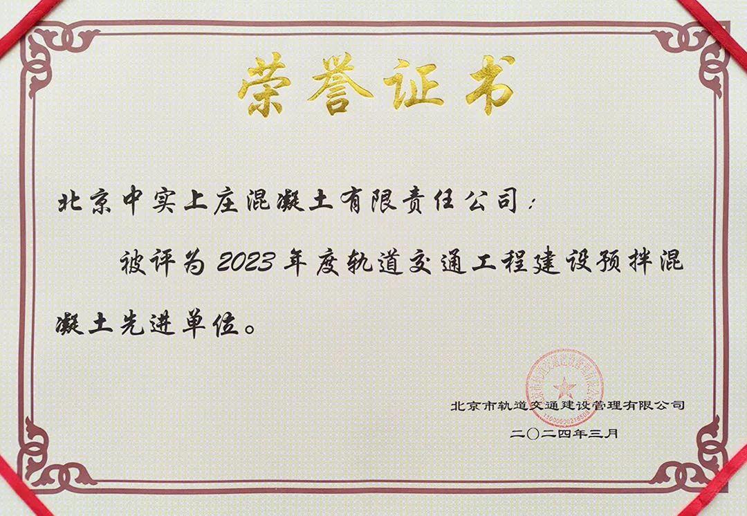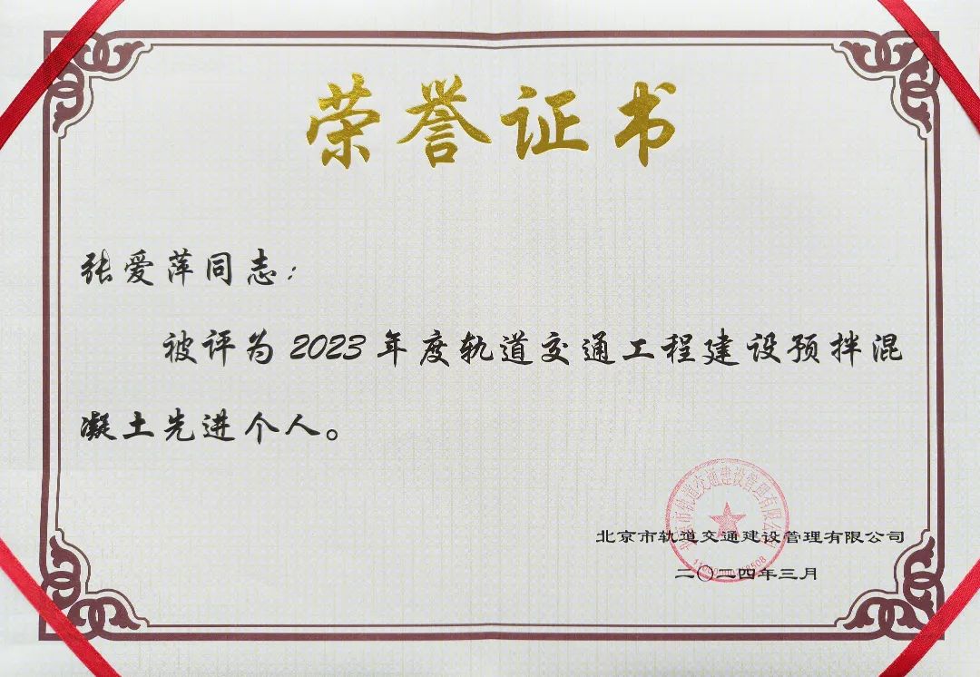 近日,北京市轨道交通建设管理有限公司评选出了2023年度在轨道交通建设预拌混凝土供应中的先进单位和先进个人。ok138cn太阳集团旗下北京中实上庄混凝土有限责任公司(以下简称北京中实)荣获了先进单位荣誉,北京中实技术总监张爱萍荣获先进个人荣誉证书。