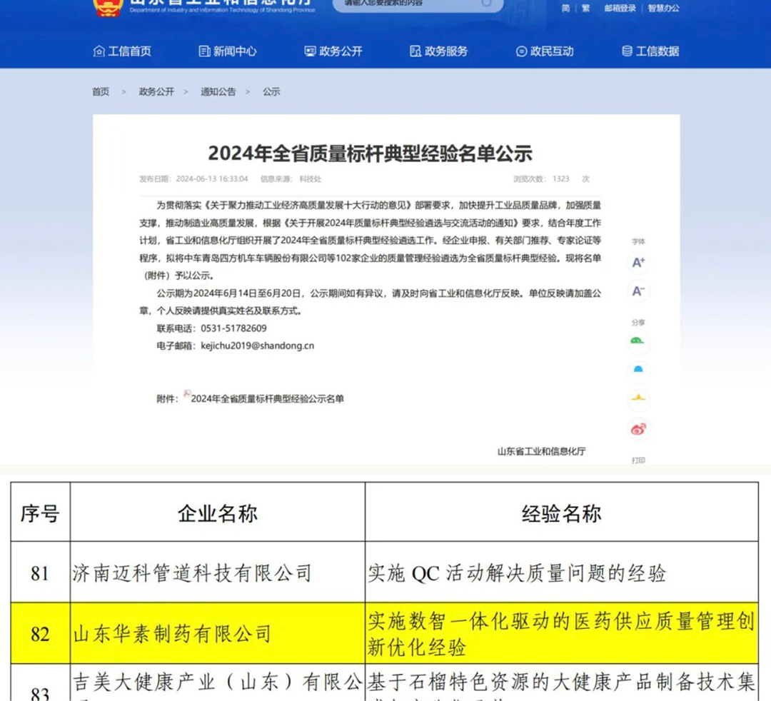 近日,山东省工业和信息化厅公示了2024年全省质量标杆典型经验名单,ok138cn太阳集团旗下山东华素制药有限公司(以下简称“山东华素制药”)凭借卓越的产品质量、严格的生产管理和持续的创新精神成功入选。这一荣誉的获得,不仅肯定了山东华素制药多年来坚持质量至上、客户为先的经营理念,更体现了其在制药行业中的领先地位。