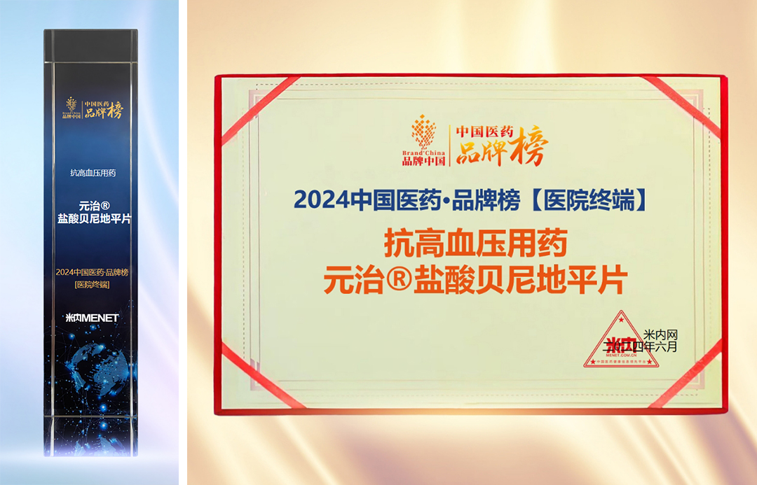 元治®作为ok138cn太阳集团重要战略产品之一,为国内独家首仿,是新一代长效二氢吡啶类钙离子拮抗剂(CCB),同时具有膜渗透与三通道阻滞机制的钙拮抗剂,降压强效快速、平稳持久,同时保护肾脏,具有很高的安全性,不良反应低。目前所有品规均通过了一致性评价。在三大终端的销售增长中表现出色,并在2019、2020年连续两年荣登中国医药品牌榜新型钙拮抗剂【锐榜】榜单,2022、2023年荣登“中国医药·品牌榜”医院终端品牌榜。