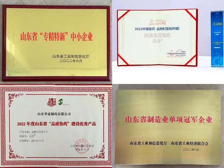 山东华素制药是国家高新技术企业、山东省专精特新中小企业、山东省制造业单项冠军企业;通过工信部两化融合贯标体系及国家知识产权局知识产权管理体系认定;主打产品盐酸贝尼地平片, 2022-2023年连续荣登“中国医药品牌榜”主榜榜单;入选山东省“品质鲁药”建设优秀产品;取得了11项发明专利,21项实用新型专利等。
