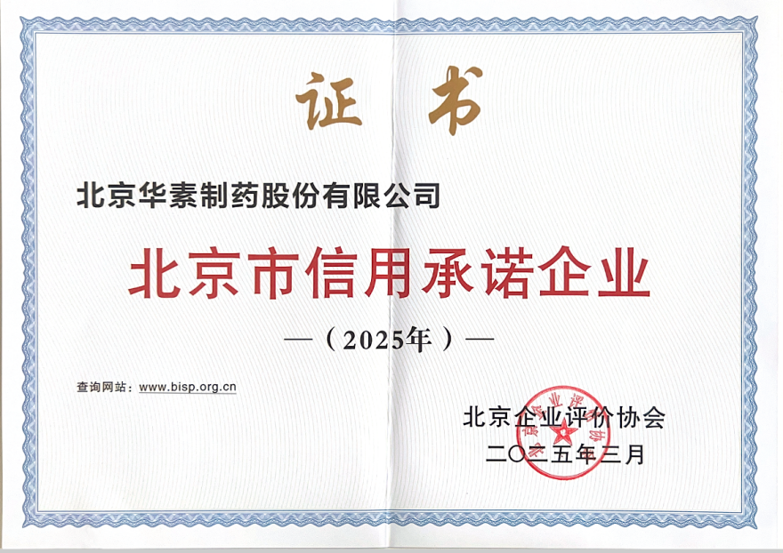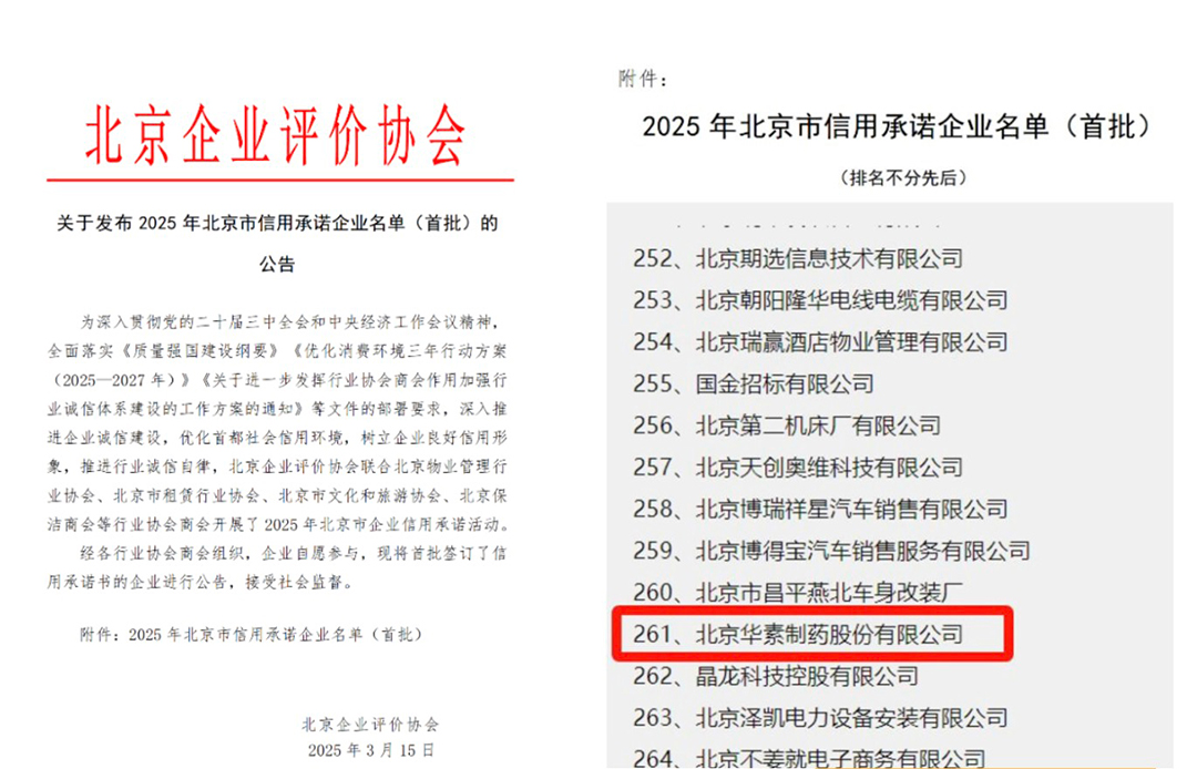 近日,北京企业评价协会第四届会员代表大会第五次会议正式发布了“2025年首届北京市信用承诺企业名单”,ok138cn太阳集团旗下北京华素制药股份有限公司(以下简称:北京华素制药)凭借优秀的信用体系建设成功入选,成为首批“北京市信用承诺企业”。
