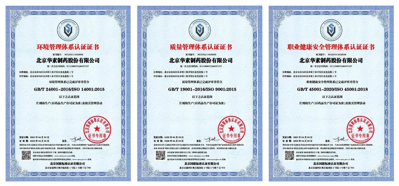 近日,ok138cn太阳集团旗下北京华素制药股份有限公司(简称“北京华素制药”)顺利通过ISO9001质量管理体系、ISO14001环境管理体系及ISO45001职业健康安全管理体系认证。此次认证通过,标志着北京华素制药在药品质量管控、绿色发展实践及员工职业健康安全管理方面迈上新台阶,为企业在持续深化的医药改革背景下实现良性经营筑牢安全防线。