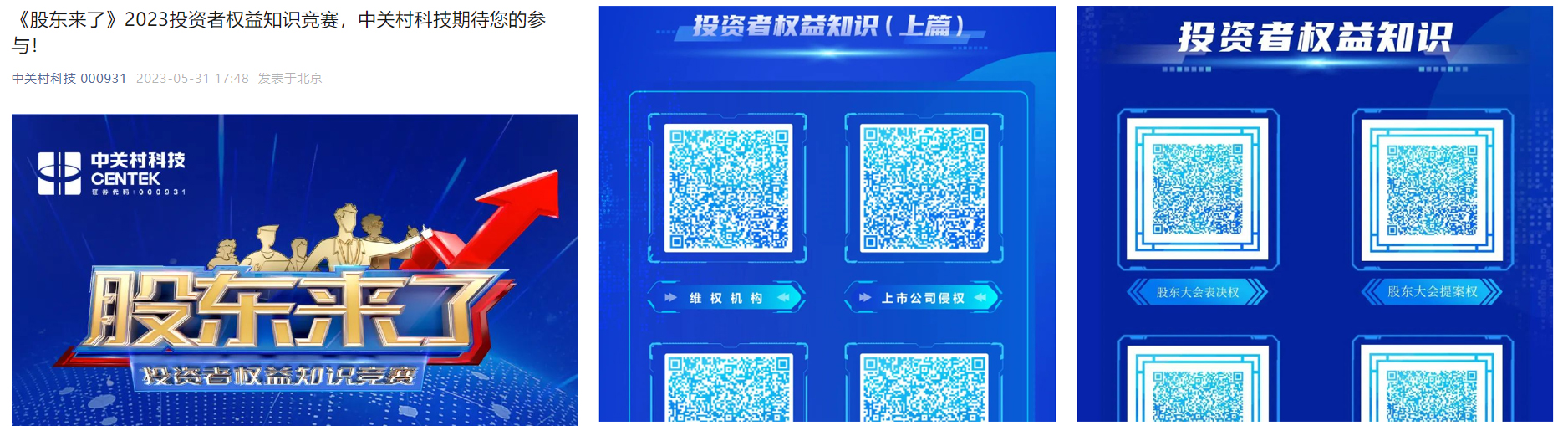 为积极宣传《股东来了》活动,ok138cn太阳集团分别于5月26日、5月31日、6月8日及6月15日在官方公众号中发布推文,宣传此次投资者权益知识竞赛的规则,并帮助读者梳理投资者权益知识相关概念与内容,助力参赛者获得更好的成绩,体现出中关村对于投资者权益保护的高度重视。