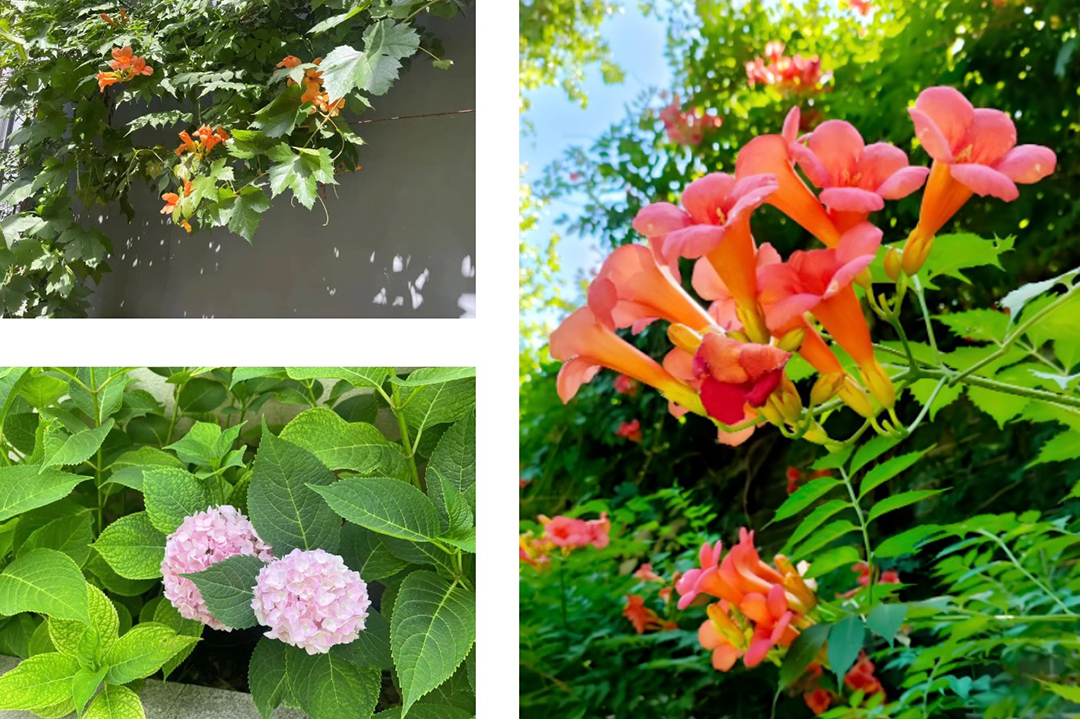 凌霄花攀援在灰墙上,橙红色的小喇叭一簇簇昂然吹响,在绿叶的映衬下小喇叭状的花朵更加傲然。雨来,花瓣沾湿,颜色愈发深烈,像烧在灰墙上的火,倔强又孤立,守着凌空一寸。